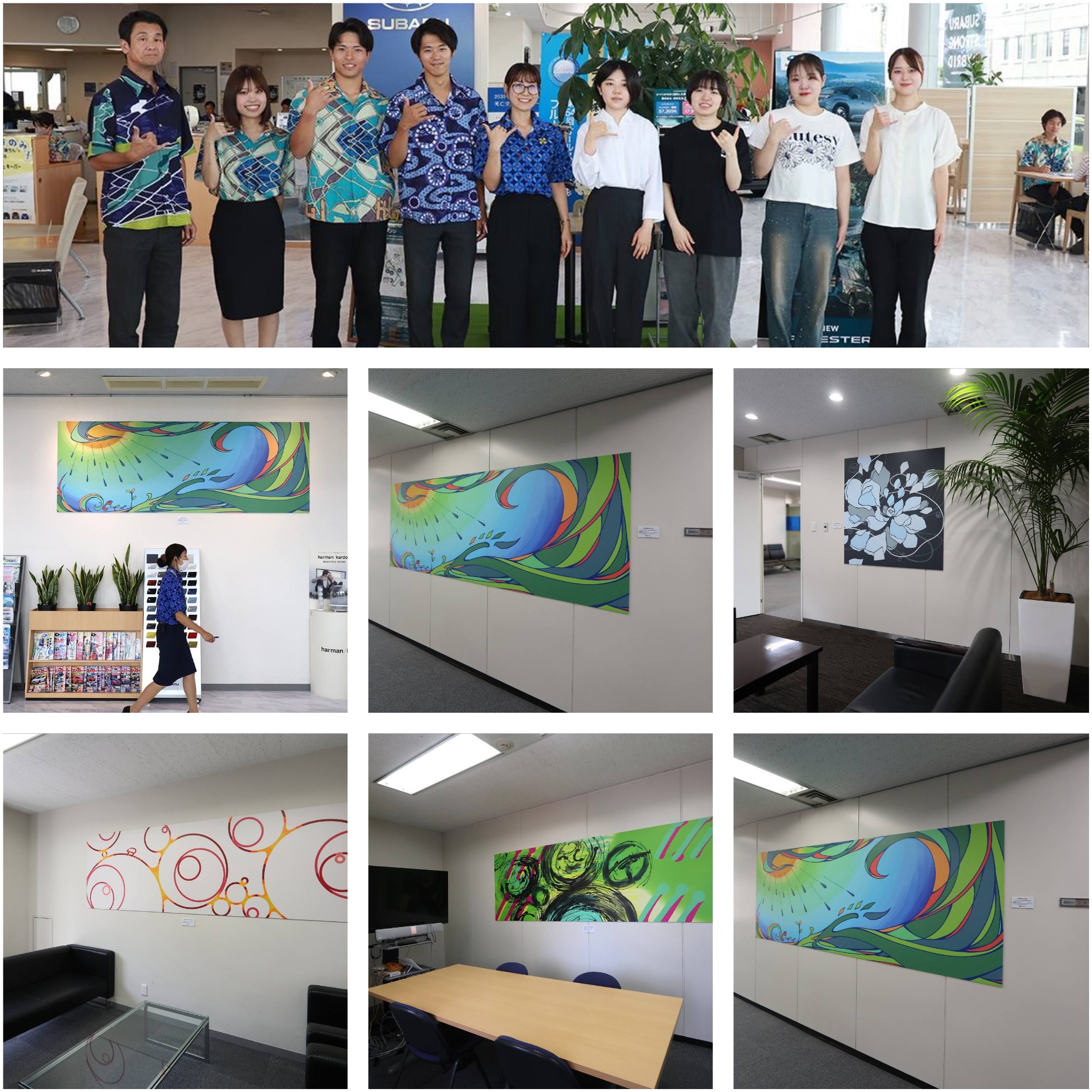 「美学美術史学科絵画ゼミ生一同」は4年生12名、3年生10名の計22名で構成されています。富士スバル株式会社との産学連携事業により、数々の制作活動を行いました。オフィスアート制作活動では、4年生の複数のメンバーの作品が富士スバル本社内に展示されました。 また、最優秀作品が群馬県内の富士スバル各販売店舗に展示され、社内外や顧客への企業理念のアピールに貢献しました。その他、富士スバル桐生店のスタッフが着用する夏期制服の、桐生アロハとのコラボレーションに、アロハシャツのデザインという面で貢献しました。桐生の地図を模したデザインや、桐生市の花サルビアをモチーフにしたデザインが採用され、スタッフにも好評でした。